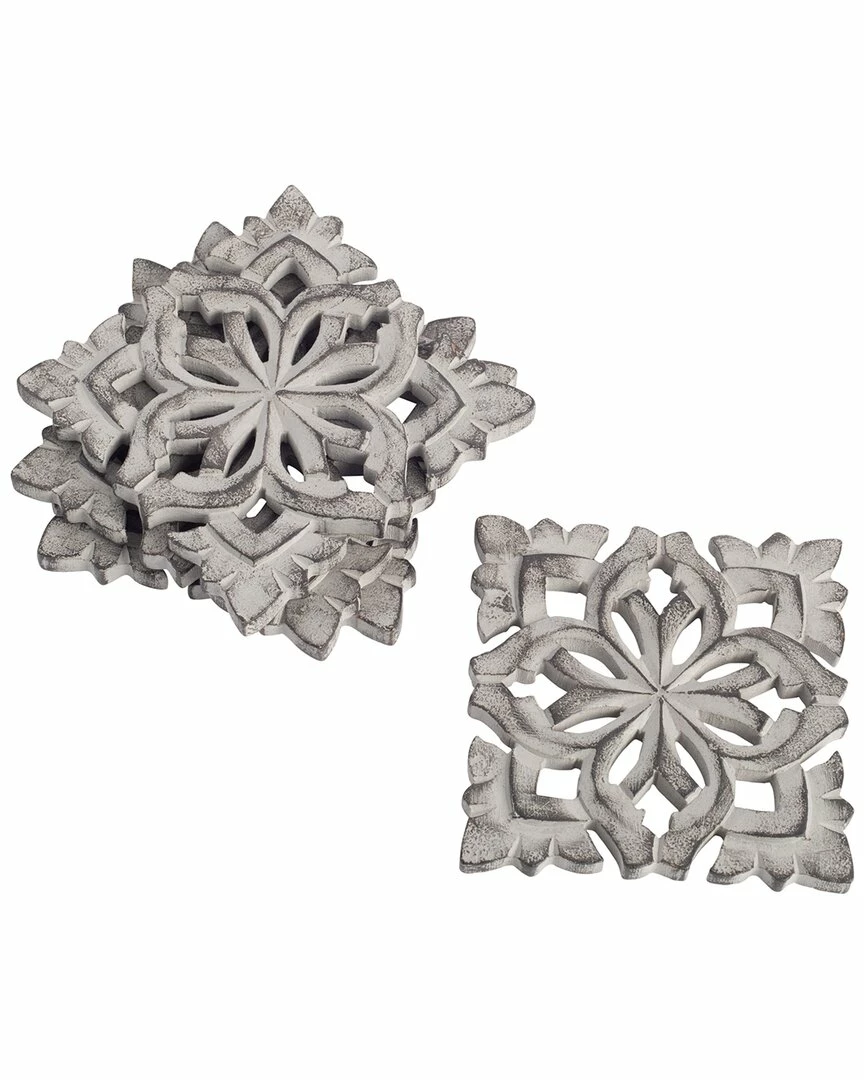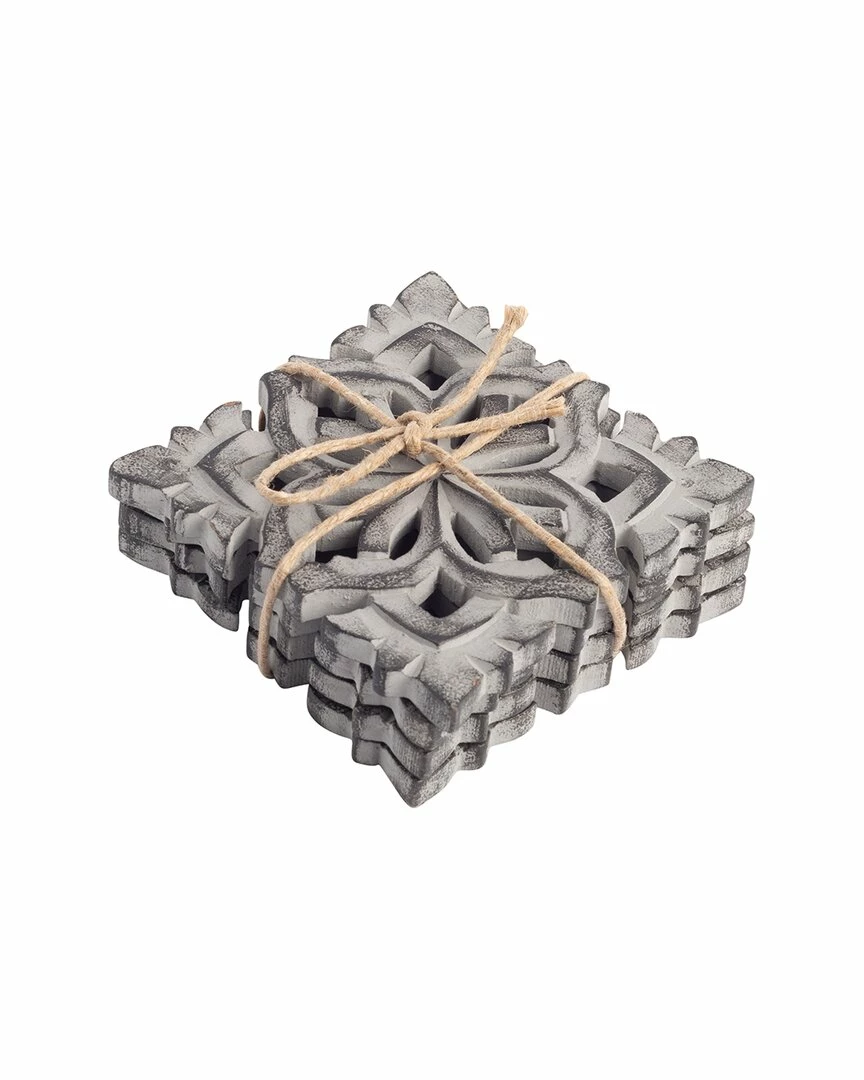 Home Essentials 4in Set Of 4 Carve Scroll Grey Wood Coaster Serveware